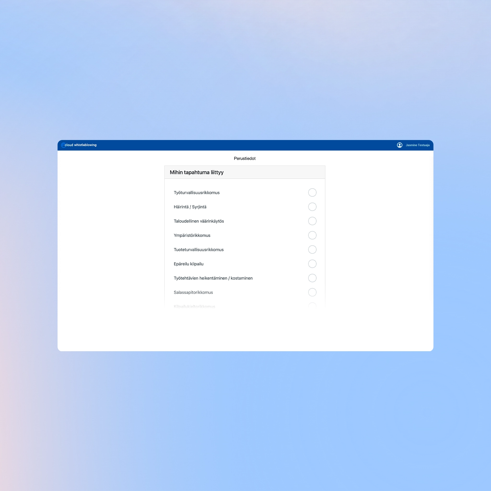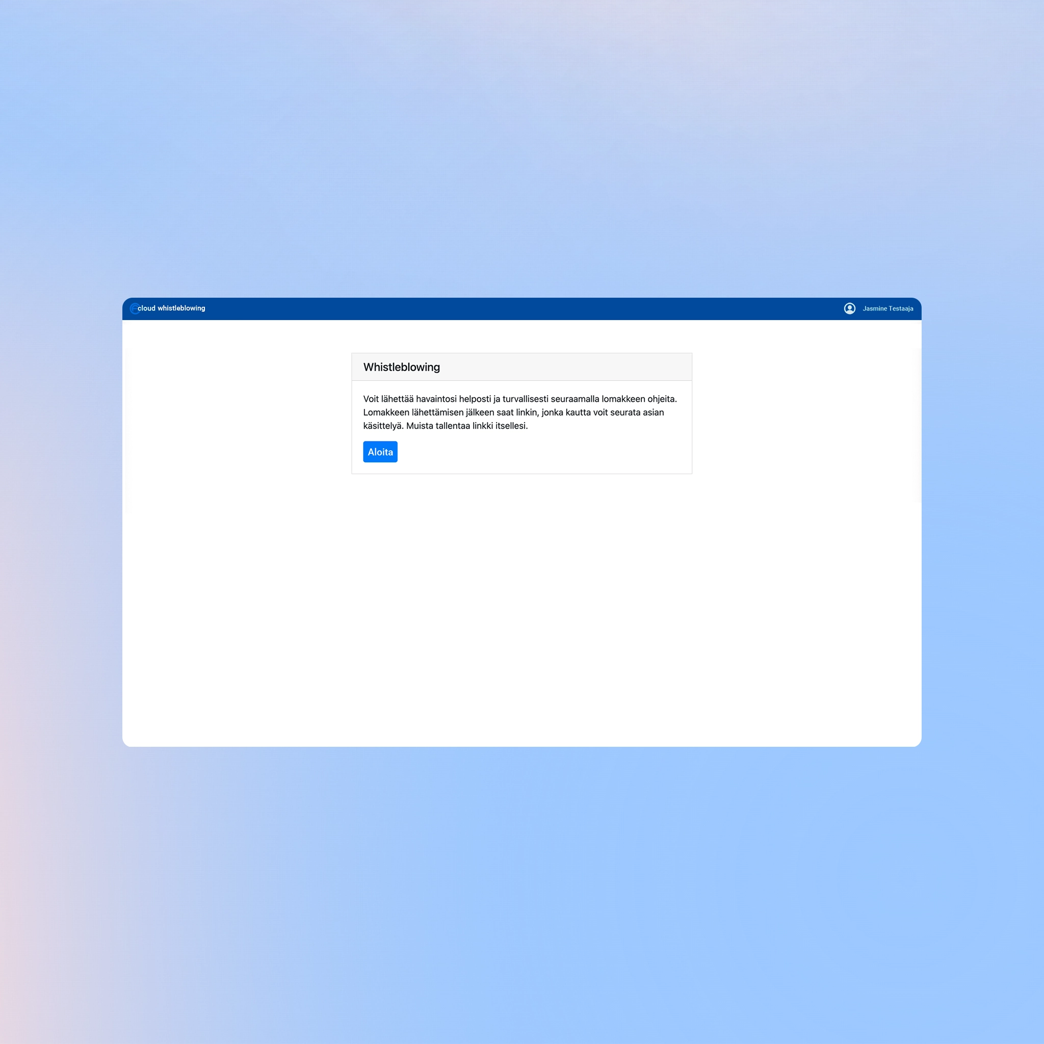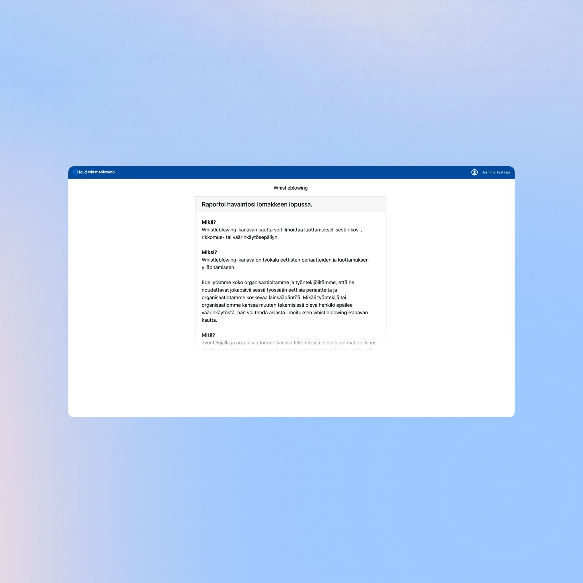 A secure and confidential channel for reporting misconduct, violations, and suspected wrongdoing. Cloud Whistleblowing helps organizations meet regulatory requirements and lowers the threshold for reporting observed inappropriate behavior. Reports can be submitted anonymously, and their progress can be followed without revealing the reporter’s identity. The service works on all devices, and the reporting channel’s landing page can be customized with the organization’s logo, brand identity, and custom instructions.